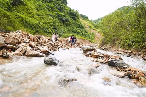 Après avoir escaladé les montagnes, les touristes font halte au bord d’un torrent.