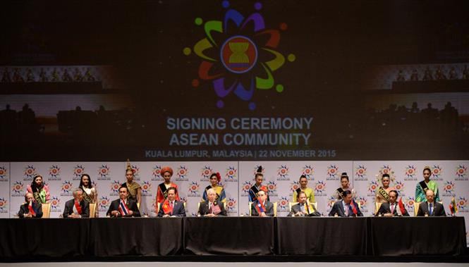 Les dirigeants de l'ASEAN lors de la signature de la Déclaration de Kuala Lumpur 2015 sur la création de la Communauté de l'ASEAN.