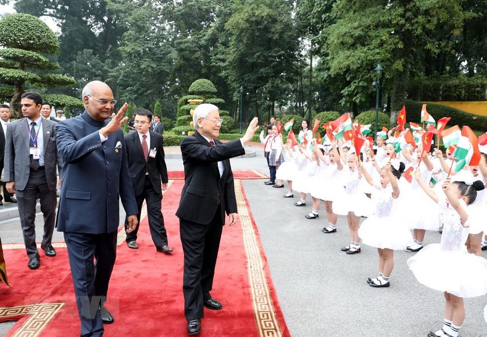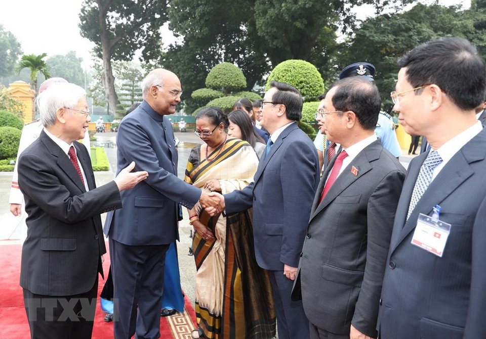 Le président indien est accueilli par le secrétaire général du Parti communiste du Vietnam et président Nguyen Phu Trong.