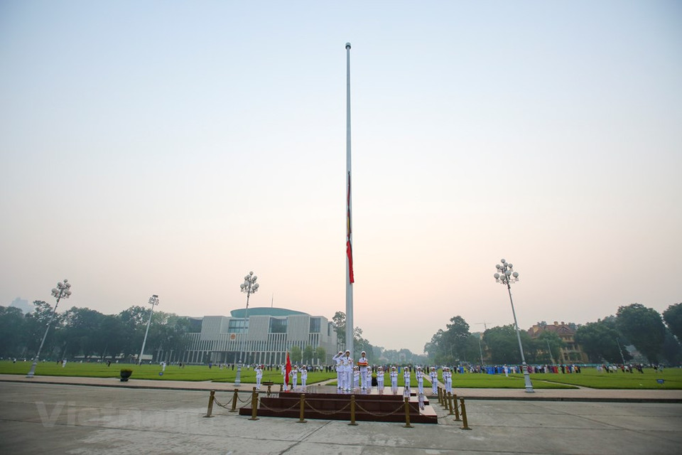 A partir de 06h00 du 6 octobre, le drapeau rouge frappé d’une étoile d’or sur la place Ba Dinh, au cœur de Hanoi, a été abaissé en hommage à l’ancien secrétaire général du Parti communiste du Vietnam (PCV) Dô Muoi. Photo: VNA