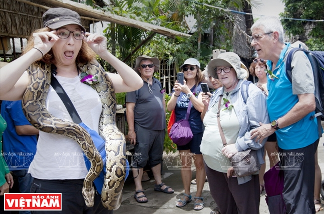 Des voyageurs étrangers à une zone éco-touristique à Tiên Giang.