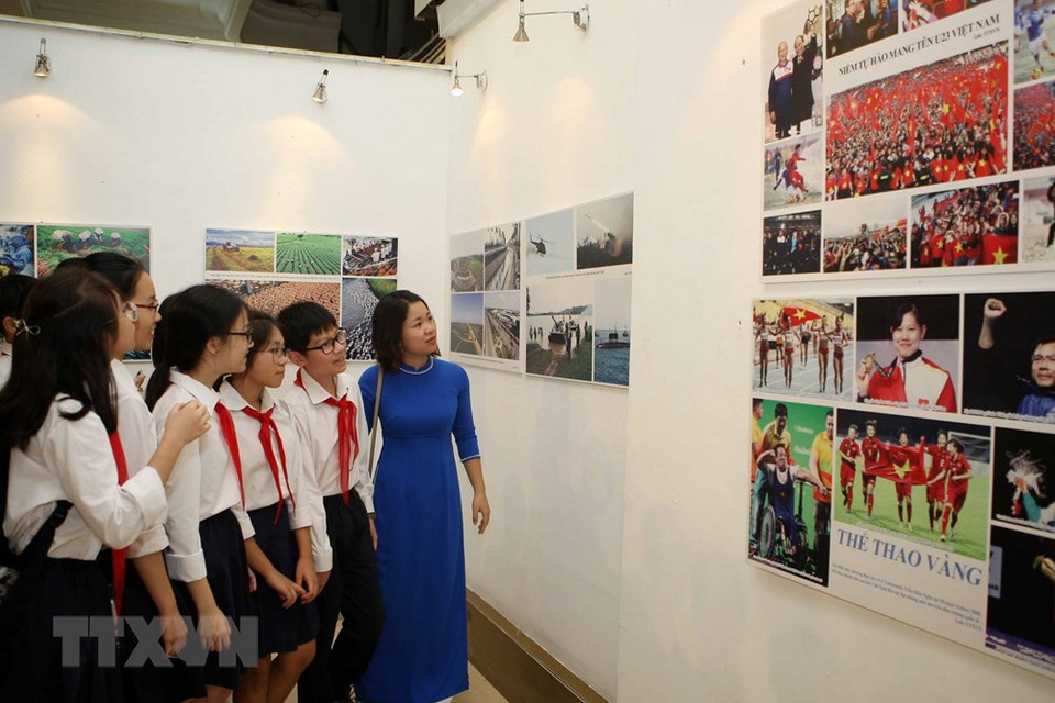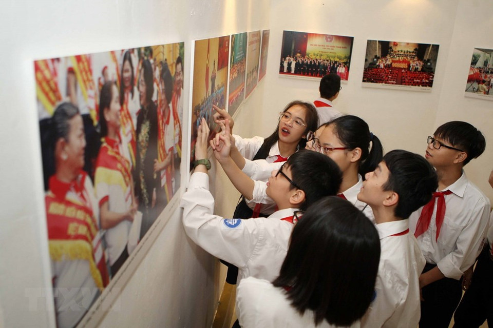 L’enseignante et les élèves du collègue Trung Vuong (Hanoï) contemplent des photos lors de l’exposition.