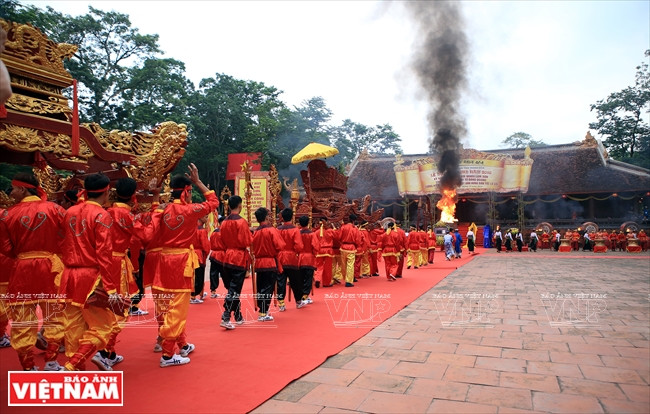 La fête a commencé par la procession du palanquin du roi Le Thai To du temple qui lui est dédié à la cour du palais de Lam Kinh.