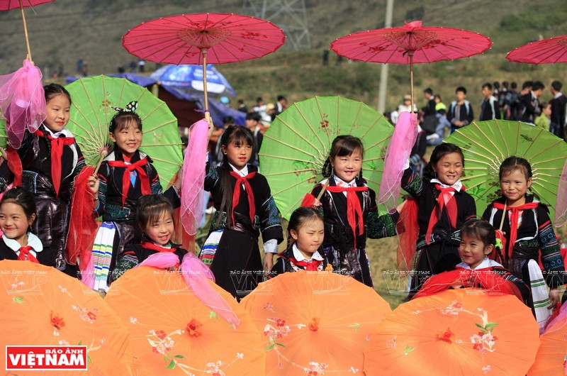 Le festival "Gau Tao" est une bonne occasion pour les réunions de famille, les jeux traditionnels et d’autres activités. Le festival de "Gau Tao" a lieu sur un champs en terrasse après les récoltes dans la commune de San Sa Ho. Les H'mong suspendent des maïs sur le "Cây nêu", la perche rituelle du Têt, afin de prier pour une année heureuse et des récoltes abondantes. Des enfants H'mong. Le Festival "Gau Tao", une particularité de l'ethnie H'mong