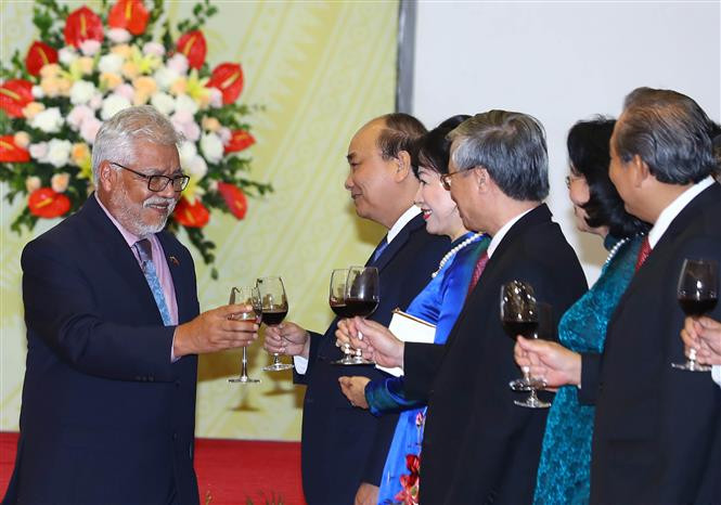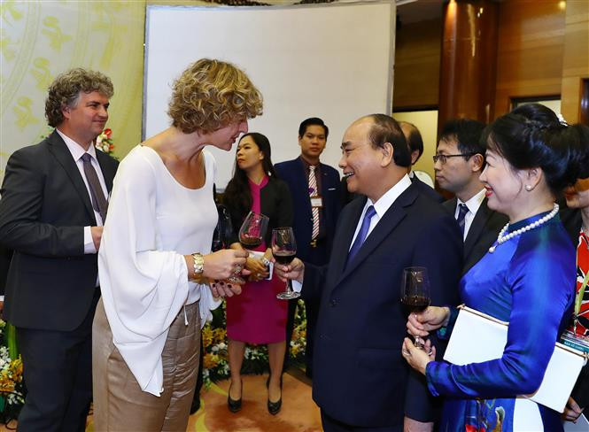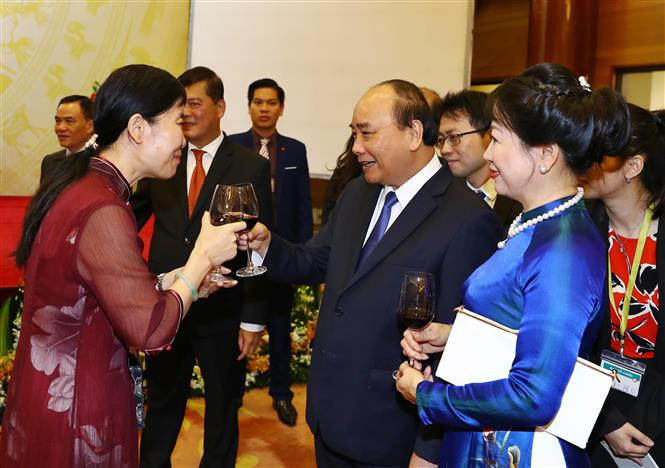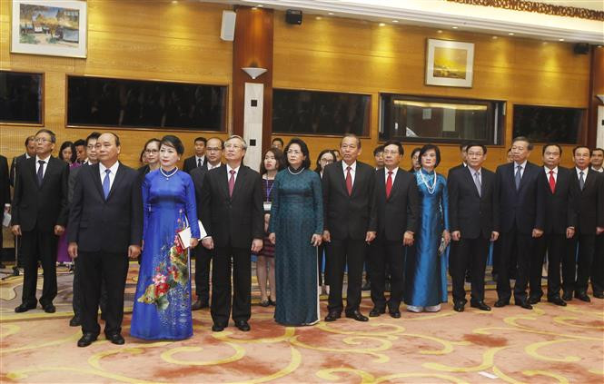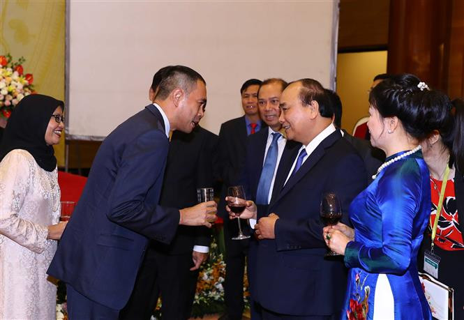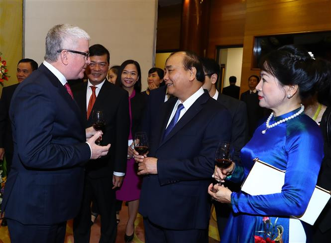 Le PM Nguyen Xuan Phuc (à cravatte de couleur bleu foncé) et son épouse (ao dài de couleur bleu foncé) président le dîner de gala pour le corps diplomatique étranger.