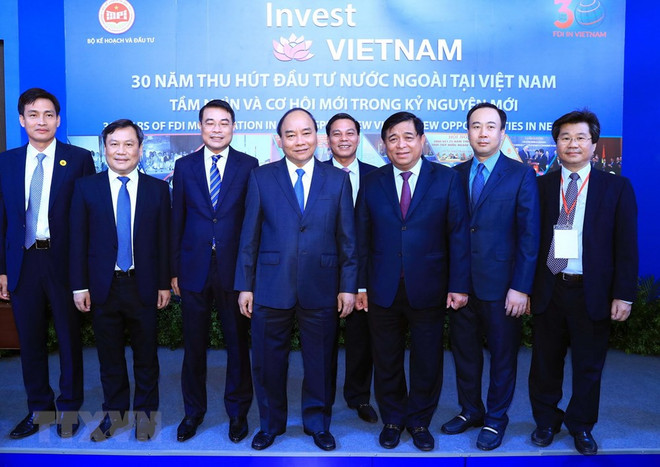 Le Premier ministre Nguyen Xuan Phuc (premier plan, 4e à partir de la gauche) et des délégués participant à la conférence. Photo : VNA Hanoï (VNA) – « Le secteur des investissements étrangers est toujours une partie importante de l’économie vietnamienne », a déclaré le Premier ministre Nguyen Xuan Phuc lors d’une conférence organisée jeudi 4 octobre à Hanoï pour dresser le bilan des 30 ans des investissements directs étrangers (IDE) au Vietnam.
