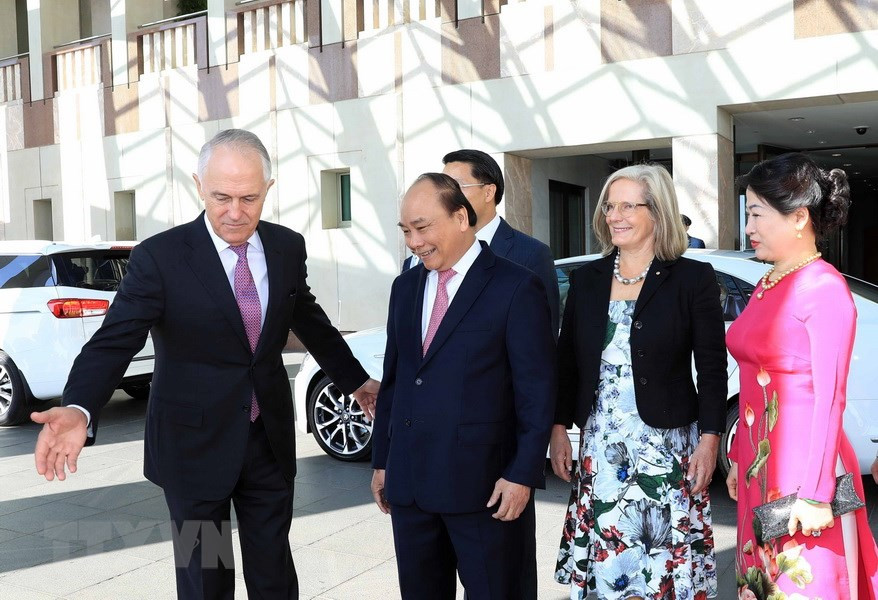 Le Premier ministre australien Malcom Turnbull (gauche) reçoit son homologue vietnamien Nguyen Xuan Phuc.