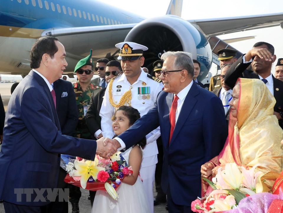 Le président Trân Quang et son épouse ont été salués par le président bangladais Mohammad Abdul Hamid avec un salut de 21 canons lors d'une cérémonie d'accueil officielle à l'aéroport international de Hazrat Shahjalal à Dacca.