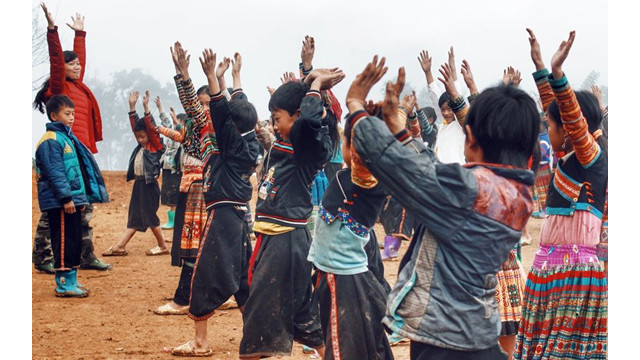 Les costumes traditionnels aux couleurs très vives des enfants Mông du village de Làng Sang. Il s’agit de l’une des régions ayant les costumes traditionnels les plus beaux de la province.