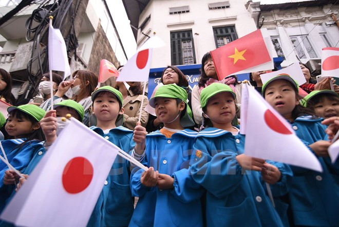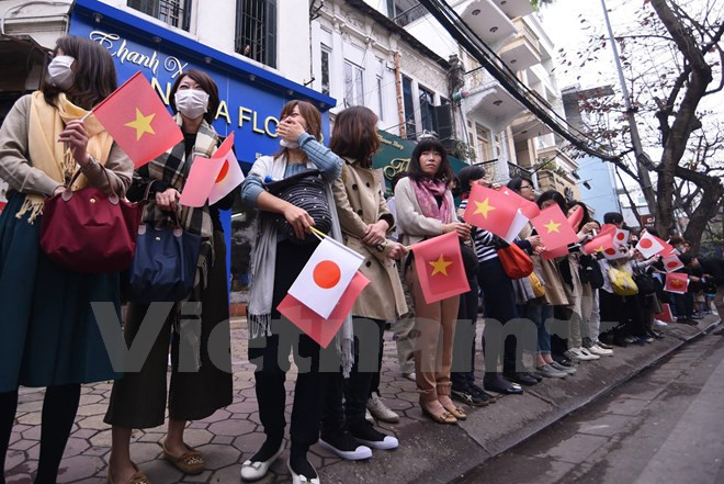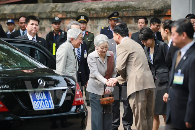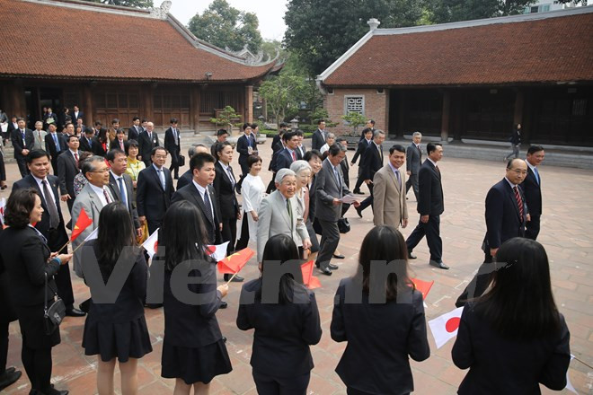 Des centaines d'étudiants et d'habitants de la capitale Hanoi ont salué l'Empereur du Japon Akihito et son épouse Michiko qui ont visité le 2 mars le Temple de la Littérature.
