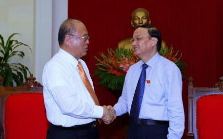 To Huy Rua (droite) reçoit le conseiller spécial de l'Alliance des parlementaires d'amitié Japon-Vietnam, Tsutomu Takebe. Photo: VNAHanoi (VNA) - To Huy Rua, membre du Bureau politique, chef de la Commission d'organisation du Comité central du Parti communiste du Vietnam et président du Groupe des parlementaires d'amitié Vietnam-Japon a reçu, lundi à Hanoi, le conseiller spécial de l'Alliance des parlementaires d'amitié Japon-Vietnam, Tsutomu Takebe.